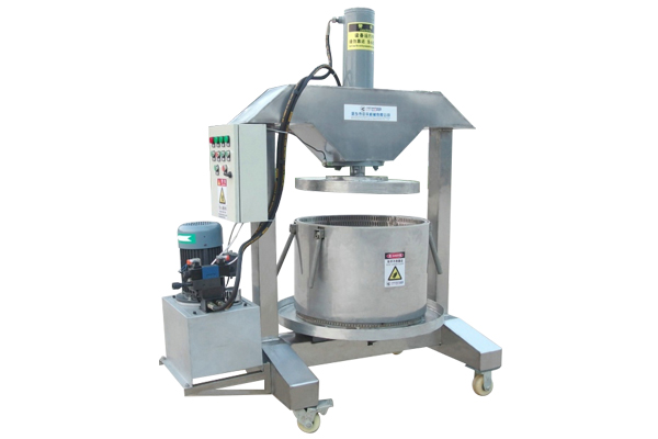 本機(jī)由機(jī)架、壓緊系統(tǒng)(手輪絲杠或者液壓系統(tǒng))、活動壓板、接汁盤、框欄組成。接汁盤放在底盤上,框欄放在接汁盤上,裝料后將其放入機(jī)架的活動壓盤下,物料在活動壓盤的擠壓下榨出汁液。為了提高皮渣芯部的出汁率,在物料之間放有導(dǎo)流盤。汁液由接汁盤收集后經(jīng)出汁管排出。