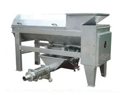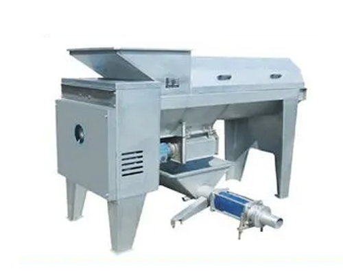 石榴從進料斗進入上破碎裝置,上破碎裝置將石榴壓開,兩輥間隙為20毫米,然后進入下破碎裝置,下破碎裝置再次將石榴擠壓,兩輥間隙為10毫米,經過兩級擠壓的石榴已基本皮籽分離,并落入分離裝置,在攪拌軸的攪拌下,石榴籽從篩孔落下,石榴皮從尾部排出,上下破碎輥為彈性結構,間隙可調。石榴籽及汁用螺桿泵送至壓榨機。